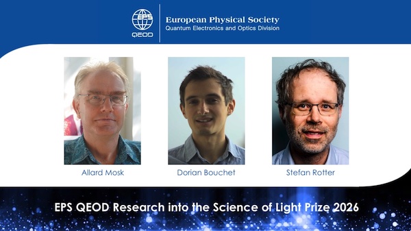 EPS QEOD Research into the Science of Light Prize 2026: The Winners are anounced!The EPS Quantum Electronics & Optics Divisionis happy to announce the winners of the EPS QEOD Research into the Science of Light Prize 2026. Allard Mosk, Dorian Bouchet, and Stefan Rotter are awarded "for their pioneering research on the fundamental limits of information and precision in electromagnetic scattering, leading to a quantitative understanding of how light carries and processes information". |